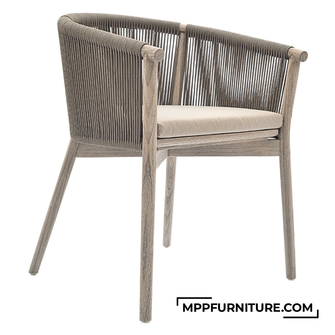 The Jenny BG Arm Chair with Cushion combines timeless design with functional comfort. Crafted by one of the best Indonesian furniture manufacturers, this rope outdoor dining chair features a strong plantation teak wood frame in a reclaimed aged finish, giving it a natural yet elegant appearance perfect for any outdoor setting.